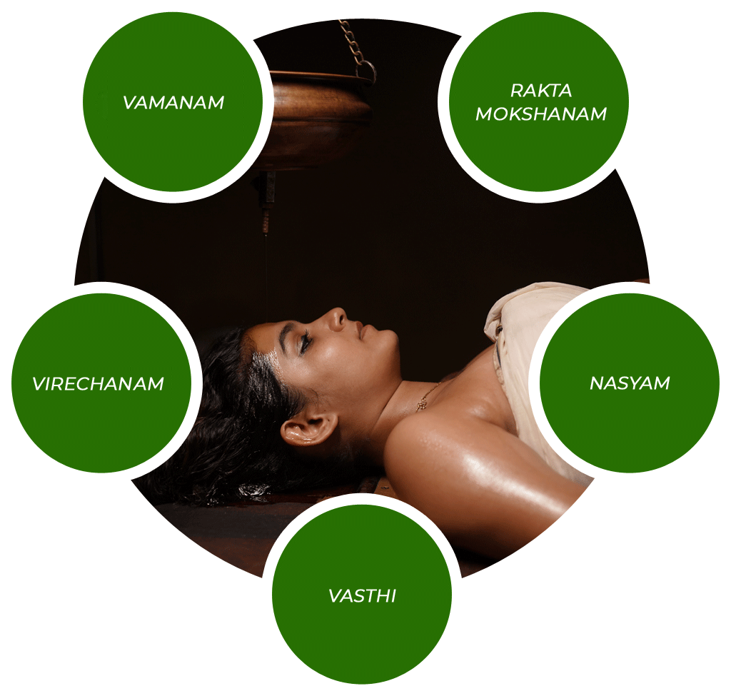 Vamanam, Virechanam, Vasti, Nasyam, and Raktamokshanam.
